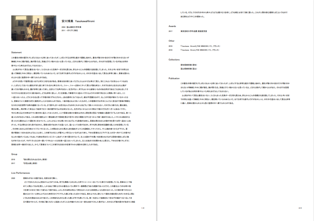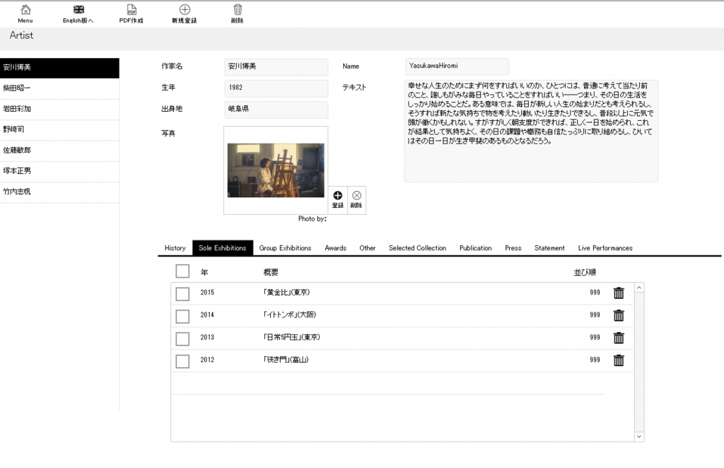 作家の活動(個展履歴、受賞履歴など)の情報を日本語/英語共にデータベース化します。