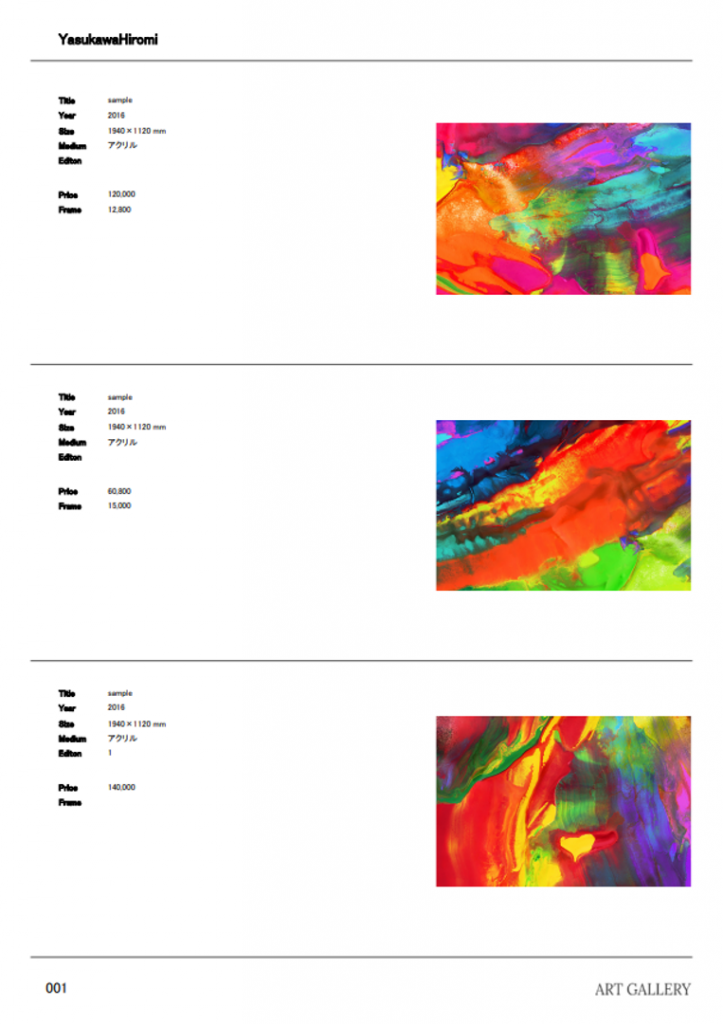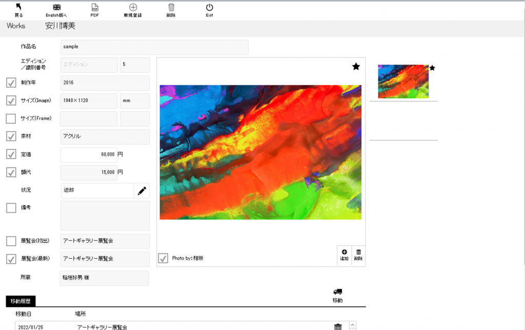 作品名や作品画像、サイズ(作品と額縁)、在庫状況、移動履歴などの情報を日本語/英語共にデータベース化します。
