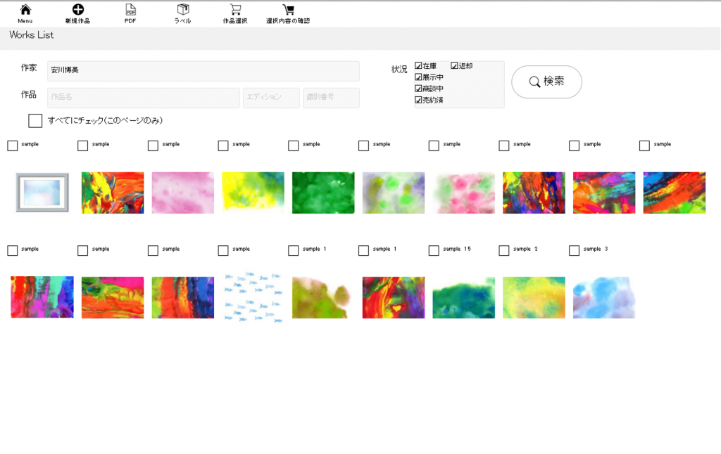 販売や展示会などのために、作家別に作品を検索し、リスト形式で表示します。
