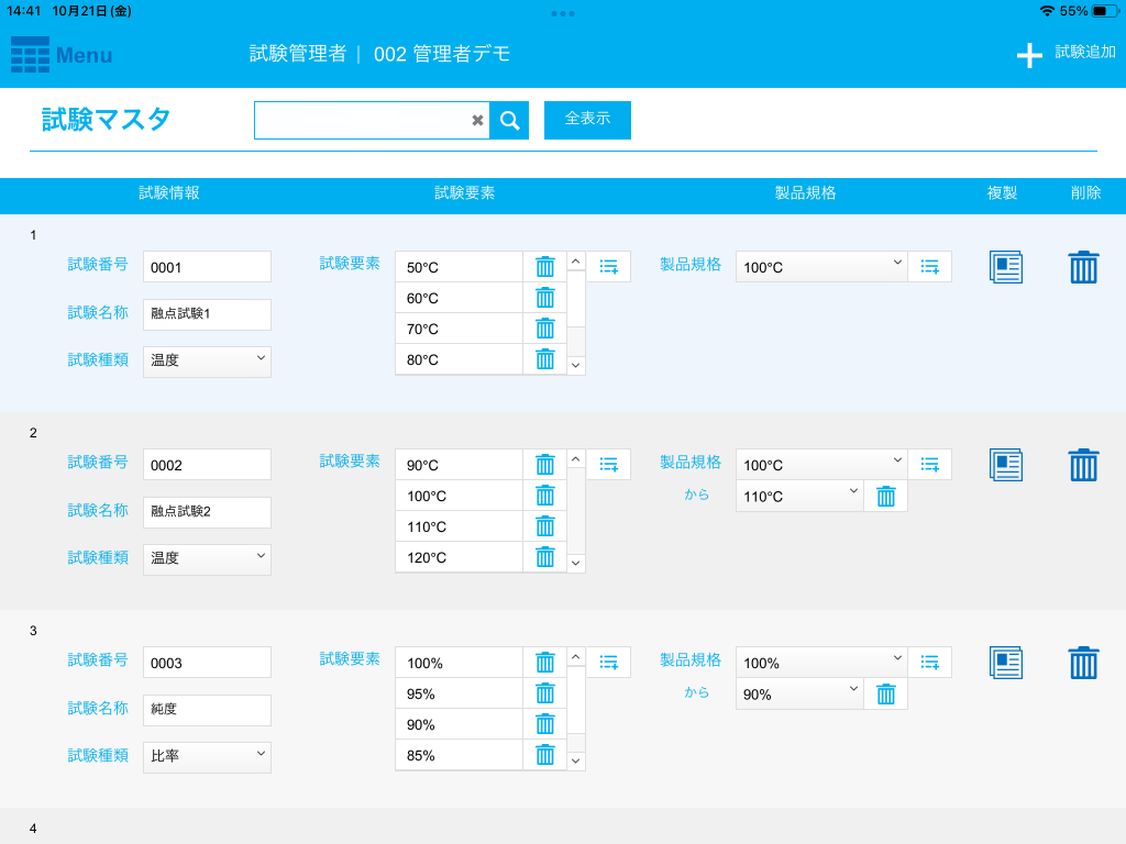 試験項目の登録しだいで、あらゆる試験管理に応用できます。
